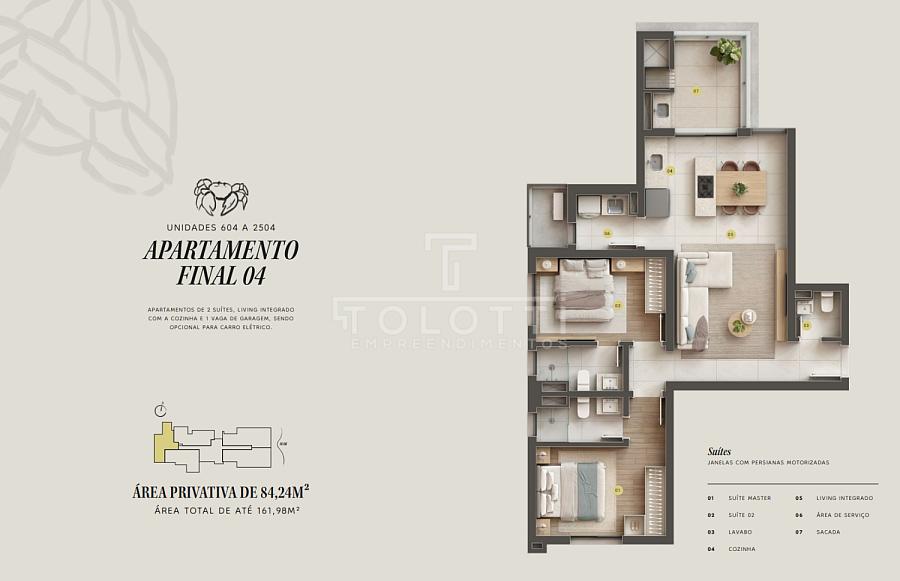 Um apartamento moderno, com planta bem distribuída e living integrado, ideal para quem busca conforto, praticidade e um imóvel com forte potencial de valorização.